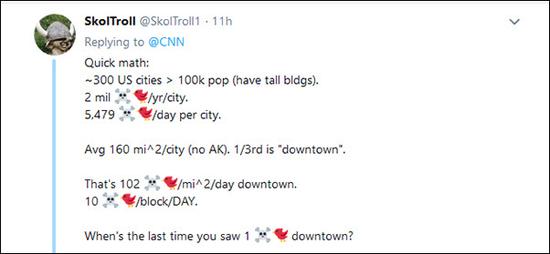 原标题:美国高楼一年害死6亿只鸟,都快赶上猫咪吃鸟的速度了 [文/观察者网 邓睿侃] 时值春暖花开,万物复苏的季节。无数鸟类即将开始它们的迁徙。然而,为了穿过高楼林立的大都市,鸟类也有潜在的危险。 据美国有线电视新闻网(简称:CNN)4月8日报道,康奈尔大学鸟类学实验室(the Cornell Lab of Ornithology)一项报告指出,每年大约有6亿只鸟因撞在美国高楼上而死亡。芝加哥,休斯敦,达拉斯,是对鸟类来说最危险的三个城市。 鸟类时常被人造灯光所迷惑,失去方向感。由于大多数高楼都是玻璃幕墙,鸟类在撞击时会受到致死创伤。 据这家鸟类实验室报告,这种现象大多出现在迁徙季——春季和秋季,数以亿计的鸟类从加拿大迁徙至拉丁美洲,途经美国中部是最危险的时候。 对鸟类来说,芝加哥是最危险的城市。鸟类飞行数千英里抵达这些城市,但它们与玻璃建筑相撞后几秒钟就死亡了。 报告中还提到,这样大量的死亡使得高楼大厦成为了仅次于放养家猫的“鸟类杀手”。(此前有美国鸟类专家通过建模估算,美国境内的猫一年可以杀死24亿只鸟和123亿只小型哺乳动物。) 美国鸟类学者凯尔·霍顿(Kyle Horton)在研究报告中表示,“芝加哥、休斯敦、达拉斯位置独特,位于北美最繁忙的‘空中走廊’中心。再加上其他几个美国的大城市的影响,这块区域在任何季度都是迁徙鸟类最大的威胁。” 纽约鸟类专家学会(New York City Audubon)分析了上述城市的威胁,并将这些威胁分为两大类。 第一类威胁是玻璃幕墙背后的植物。这些植物,甚至是玻璃幕墙附近的花园会将鸟类误入歧途,让它们以为那里是理想的休憩地点。 第二类,也是最重要的一类,是由于大多数鸟类成功进化了夜间迁徙的能力。数据显示,北美洲有70%的鸟类需要迁徙,而其中有80%是在夜间迁徙的。它们在黑暗中被摩天大楼的光芒吸引、迷惑,最后导致相互碰撞或与大楼碰撞。有的时候,鸟类会因为灯光的误导而在一处打转,最终精疲力尽掉落在不适宜居住的地方。不只是摩天大楼的光芒,像街灯、交通信号灯都能影响鸟类。 在凯尔·霍顿的报告中,这些灯光被统一定义为“夜间人工光”(Artificial light at night,简称ALAN)。目前全球的ALAN仍在不断增长,鸟类迁徙所受到的威胁也随之上升。为这些鸟类提供保护措施的一个难点在于,ALAN种类繁多,包含明亮光源以及昏暗的杂散光,很难找到一项完全的措施。 目前,纽约鸟类专家学会正致力于一项名为“安全飞行”的鸟类保护项目。与此同时,一个名为“纽约熄灯”(Lights Out New York)的附属项目也在鼓励高层建筑的业主在两个迁徙季节关灯,以帮助保护鸟类和降低能源成本。 凯尔·霍顿表示,这是一个大范围的问题,我们的目标是大幅度减少城市的光污染。不过值得庆幸的是,小范围的熄灯举措也能起到一些作用。 4月9日,CNN在其推特上发表了这则报道,得到的回应也是各不相同。 有网友说,这个问题建筑师也要重视。 有网友则说现在的高楼太高了。 也有网友说,他们很少在城市里看到死去的鸟类,报道不属实。 也有人算起了数学。得出结论是,“每天每个街区有10只死鸟。你上一次在城市里看到死鸟是在什么时候?” 观察者网查阅该报告,文中称他们的项研究基于卫星获得的光污染水平数据,和显示鸟类迁徙密度的天气数据。随后通过将每幢建筑鸟类死亡率的概率分布乘以建筑数量的分布来估计每一建筑类别的死亡率。最后得出的结论是,每年因撞在美国高楼上死亡的鸟类约为5.99亿。不过,该报告在许多数据上使用了估算(estimate),数据准确性并不能完全保证。 除了以上评论,另外很有意思的一点就是,此推特下也有不少网友开始调侃起特朗普来。原因是不久前,特朗普表示风车可能致癌。。。